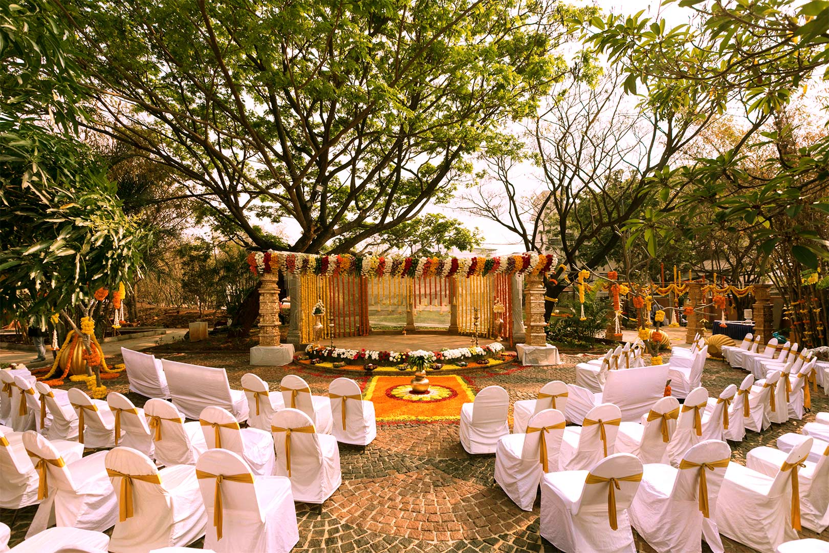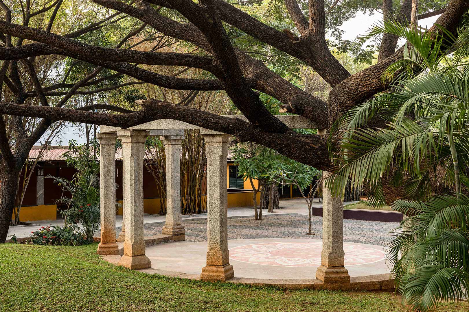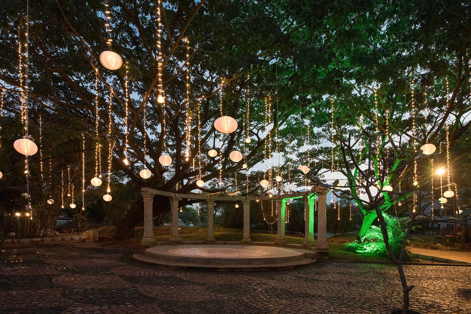 Indradhanush is a mini amphitheatre; a performance space framed by a rustic stone arch and seven pillars surrounded by a canopy of sheltering trees. This space is perfect for gatherings between 300 to 500 people. The intimate space, the warm combination of lush greenery, and romantic stone makes the space perfect for theatre, music concerts or even private socio-cultural events.